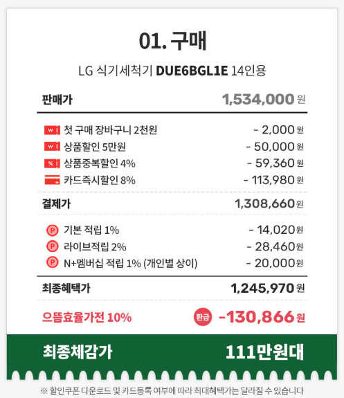 [으뜸효율 대상] [체감가 111만원대] LG 디오스 오브제컬렉션 식기세척기 DUE6BGL1E 1등급 14인용 빌트